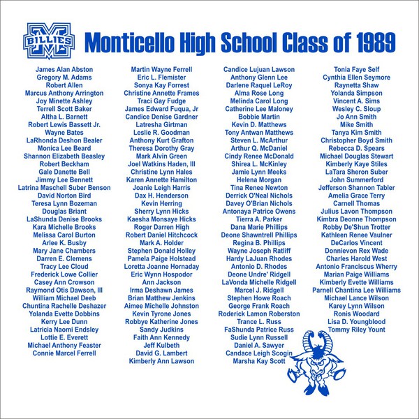 To ensure better service to you, the Monticello High School c/o 1989 Reunion coordinator has decided to use the Novel T’s Reunion Service. Under this program, you will be able to order your reunion items directly from the company, thus simplifying the process. To make sure that you and you are not left out of any part of this wonderful occasion, we ask for your full cooperation. You may order your reunion items online here. Your order must be received by Novel T’s no later than September 13, 2024 to ensure that your order is processed in time for your reunion on October 11, 2024. Orders received after the deadline may not be honored. So please, don’t miss out!